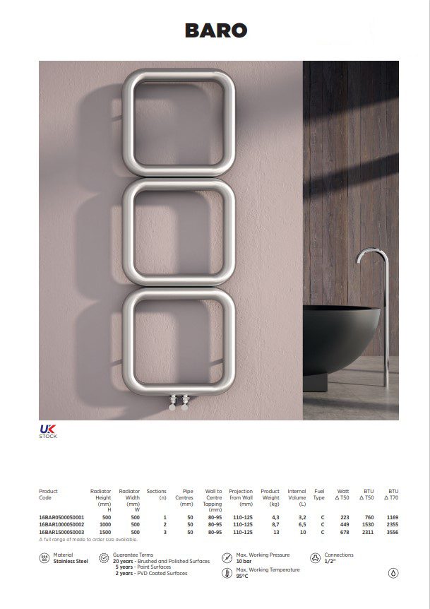 Дизайнерската лира за баня BARO впечатлява със своя балансиран силует и модерна визия, които придават завършен и елегантен облик на всяко пространство. Изчистената ѝ форма я превръща в стилен акцент, съчетаващ функционалност и съвременен дизайн. BARO е подходящ избор за бани, в които комфортът и естетиката се допълват хармонично. За информация относно цени, налични цветове и възможни размери, моля свържете се с нас.